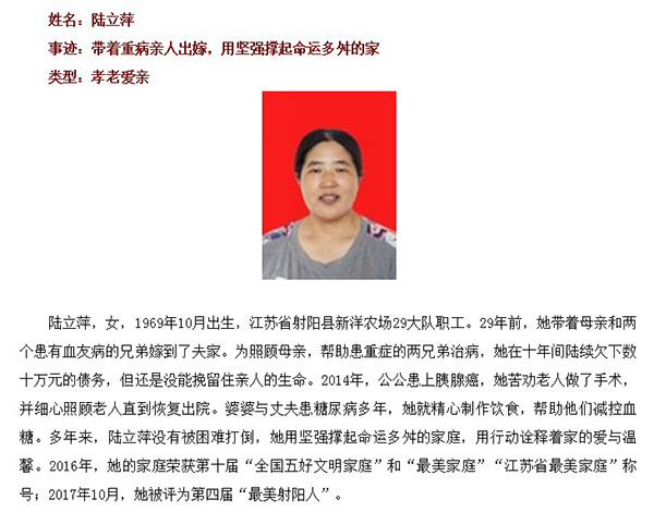 29年前,陸立萍帶著母親和兩個生病的兄弟嫁到夫家,哥哥、母親、弟弟相繼因病去世,治病留下數(shù)十萬元的債務(wù)。在丈夫和公婆的疼愛與默默支持下,她堅強走到今天。2014年,公公被確診為胰腺癌,老人住院期間,她貼心照顧,老人很快恢復(fù)出院;婆婆與丈夫均患糖尿病,她精心制作飲食,幫助減控血糖,用心詮釋著家的愛與溫馨。此前,陸立萍曾榮獲第十屆“全國五好文明家庭”、2016年全國“最美家庭”、2017年“最美射陽人”等稱號。