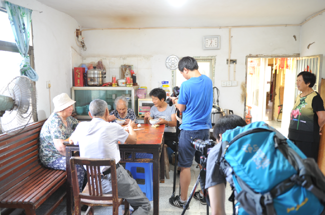 8月20下午-21日,澎湃新聞采訪組視頻記者朱偉輝、視頻編輯龍景和射陽縣新聞單位的3名記者在農(nóng)場宣傳部門相關(guān)人員的陪同下,用一天半的時(shí)間,實(shí)時(shí)用鏡頭記載百歲老人從凌晨起床、喝早茶、散步、游玩和吃飯、擇菜、做針線活以及與家人、鄰居等聊天的情況,感受百歲老人尋常的起居生活。而每拍攝一場老人的生活起居或是生活畫面,總是讓來自上海澎湃新聞采訪組的記者大加贊嘆。圖為澎湃新聞采訪組在拍攝百歲老人生活起居的一組鏡頭。