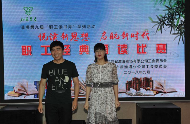 9月4日下午,在淮海工會(huì)舉辦“悅讀新思想 啟航新時(shí)代”職工經(jīng)典誦讀比賽上,來(lái)自二分場(chǎng)社區(qū)代表隊(duì)的任超龍和機(jī)關(guān)代表隊(duì)的欒艷彥在與來(lái)自淮?;鶎?/span>16個(gè)單位選手的比賽中,雙雙獲得經(jīng)典誦讀二等獎(jiǎng)。當(dāng)他們夫妻攜手登臺(tái)領(lǐng)獎(jiǎng)時(shí),博得了現(xiàn)場(chǎng)60多名觀眾長(zhǎng)時(shí)間的掌聲。