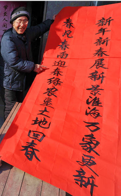 今年春節(jié)前夕,葛老特地用書法寫了“新年新春展新景淮海萬象更新,春風(fēng)春雨迎春綠農(nóng)墾大地回春”的詩句春聯(lián),讓周邊鄰居看了別有一番風(fēng)味。