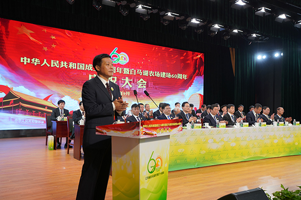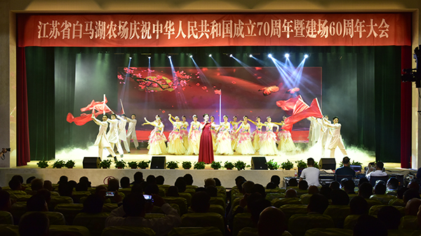 9月23日,在節(jié)日般的喜慶氛圍中,白馬湖農(nóng)場有限公司干部職工代表和特邀嘉賓共450人歡聚一堂召開慶祝大會(huì),共同慶祝中華人民共和國成立70周年暨白馬湖農(nóng)場建場60周年。集團(tuán)公司總經(jīng)理、蘇墾農(nóng)發(fā)董事長胡兆輝,淮安區(qū)委書記徐子佳出席并講話,白馬湖農(nóng)場公司黨委書記、董事長、總經(jīng)理姚春華致辭,黨委副書記韓正光主持大會(huì)。