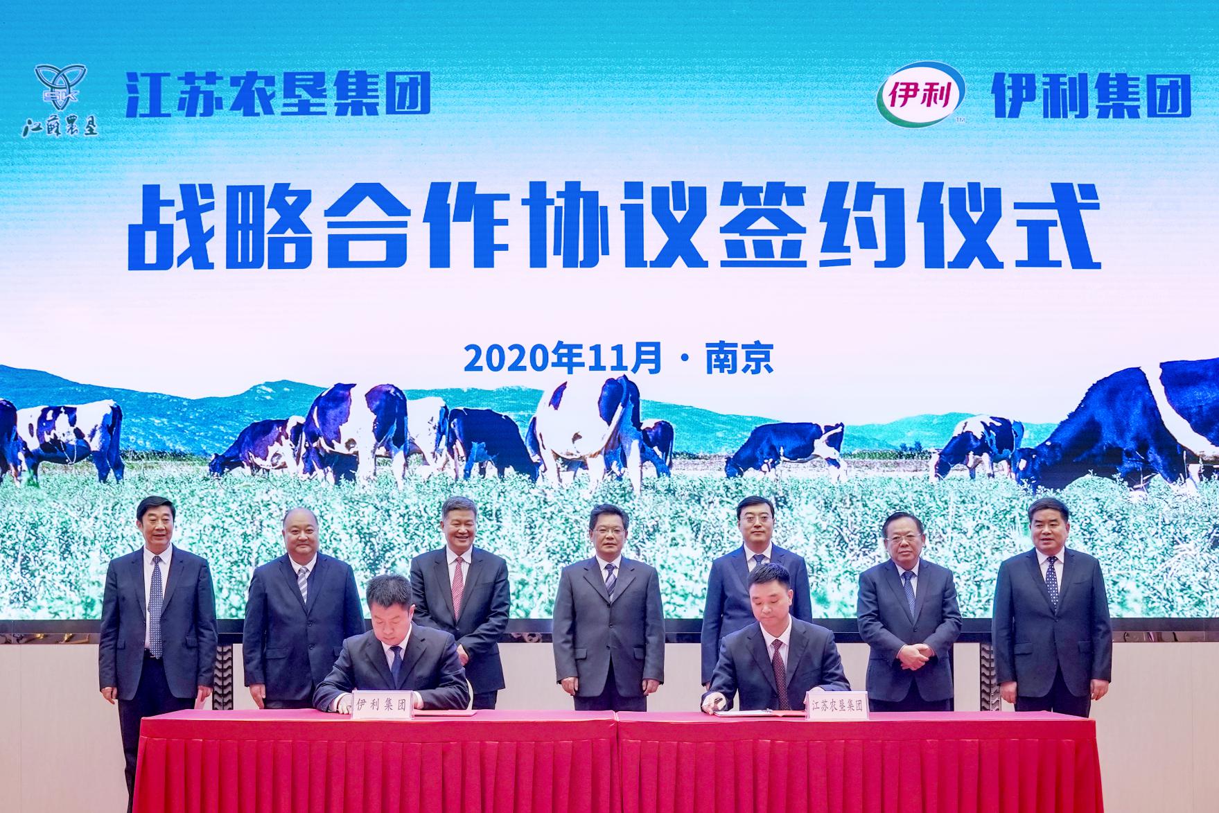 為落實(shí)國家及江蘇省奶業(yè)振興戰(zhàn)略,實(shí)現(xiàn)資源優(yōu)勢(shì)互補(bǔ),通過強(qiáng)強(qiáng)聯(lián)合共同建立長(zhǎng)期穩(wěn)定的戰(zhàn)略合作關(guān)系,11月26日,江蘇省農(nóng)墾集團(tuán)有限公司與內(nèi)蒙古伊利實(shí)業(yè)集團(tuán)股份有限公司在南京簽署戰(zhàn)略合作備忘錄。省委副書記任振鶴,省委副秘書長(zhǎng)趙旻,省農(nóng)業(yè)農(nóng)村廳廳長(zhǎng)楊時(shí)云,省國資委一級(jí)巡視員王寧生,伊利集團(tuán)黨委書記、董事長(zhǎng)、總裁潘剛,集團(tuán)公司黨委書記、董事長(zhǎng)魏紅軍出席簽約儀式,集團(tuán)公司黨委副書記、總經(jīng)理胡兆輝主持簽約儀式。