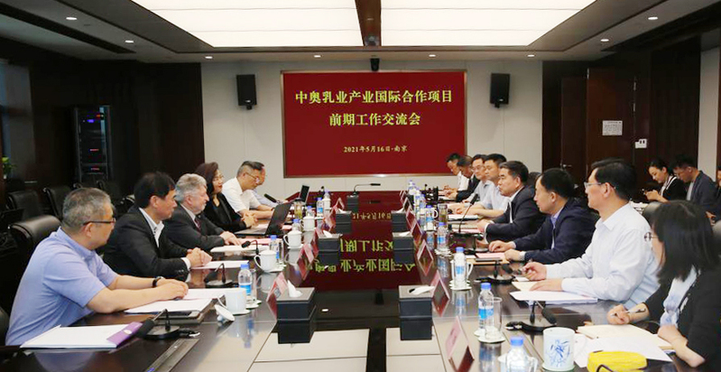 5月16日下午,中奧乳業(yè)合作項目前期工作交流會在集團總部舉行。中奧乳業(yè)合作項目高級顧問、奧地利自然資源與應用生命科學大學教授Alfred Pitterle、奧方總協(xié)調人習國燕、奧地利華人商會執(zhí)行會長曾一立,集團公司黨委書記、董事長魏紅軍、副總經理姜建友、劉耀武、總法律顧問吳以國、董事會秘書孟亞平出席會議。