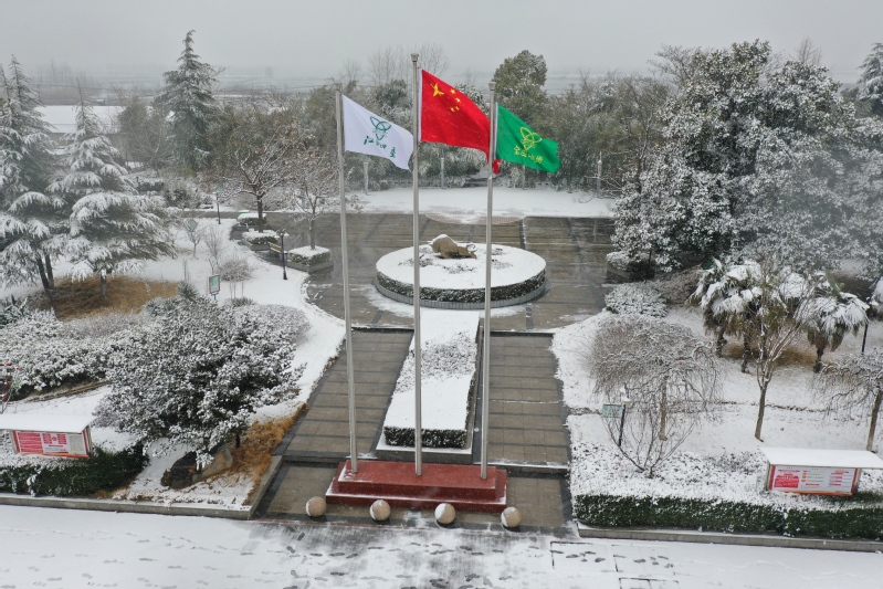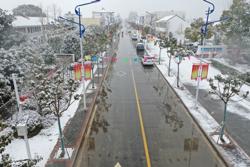 高大的銀杏樹、柿子樹,落光了葉子的枝杈上,一條條毛茸茸、亮晶晶的銀條兒好像蟄伏著的蠶蟲;修長的香樟、低矮的柏樹,四季常青枝葉上,一朵朵蓬松松、沉甸甸的雪球,仿佛舉起的棉花糖。“呼……”一輛晨起的公交車閃著光駛過,一面面紅旗也迎風(fēng)雀躍起來,似乎在說“又是一個豐收年”。