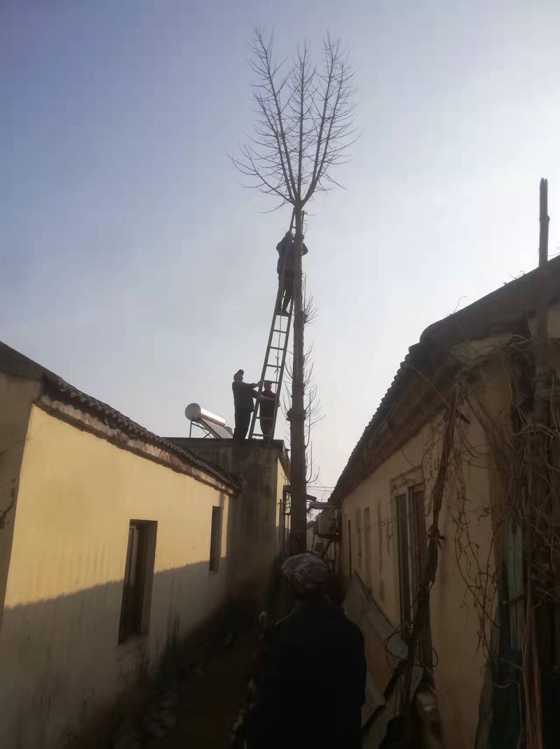 3月9日上午8時(shí),按照事先制定的方案,由農(nóng)場(chǎng)社區(qū)環(huán)綠所所長(zhǎng)張海濤帶隊(duì),城西居委會(huì)協(xié)助,和環(huán)綠所員工一行7人來到幸福小區(qū)。首先對(duì)最高最粗最難砍伐的銀杏樹進(jìn)行砍伐。為防止大樹倒下砸壞兩邊房屋,有砍伐經(jīng)驗(yàn)的環(huán)綠所老員工李素兵現(xiàn)場(chǎng)提出:“從上到下,分段砍伐?!痹谡鞯脧埶L(zhǎng)及眾人的同意后,李素兵立馬系好安全帶攀上樹頂,用手工鋸將銀杏樹頂端的叉枝逐個(gè)鋸掉,然后又用電鋸將銀杏樹從上到下分4段切割,最終平穩(wěn)將銀杏樹砍伐。緊接著一行人又來到另兩顆樹的地方,用同樣的方式,互相協(xié)作,很快又將兩顆樹砍伐?,F(xiàn)場(chǎng)圍觀的居民群眾對(duì)砍伐房前屋后到三顆樹個(gè)個(gè)拍手稱快。李志明老夫婦倆看到自家廚房后面10多米高的銀杏樹被伐,說了一句:“從今往后總算能睡個(gè)安穩(wěn)覺了,謝謝大家,謝謝!謝謝……”
