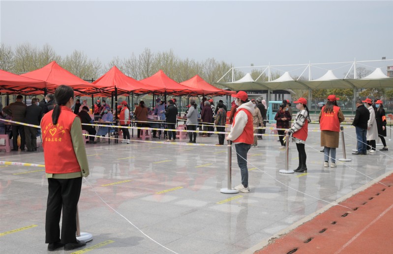 連日來,在淮海農(nóng)場職工休閑體育運(yùn)動廣場和農(nóng)場文化廣場上,隨處可見一抹“志愿紅”,他們當(dāng)中,有的手持小喇叭,一遍又一遍重復(fù)著“佩戴好口罩,保持好距離”的話語;有的人手一把測溫槍,堅守在卡口點不厭其煩地測量著經(jīng)過人的體溫;有的前后跑動著,為老年人、殘疾人提供便民服務(wù);有的變身“大白”“淺藍(lán)”,為核酸檢測采樣前進(jìn)行掃碼登記工作……