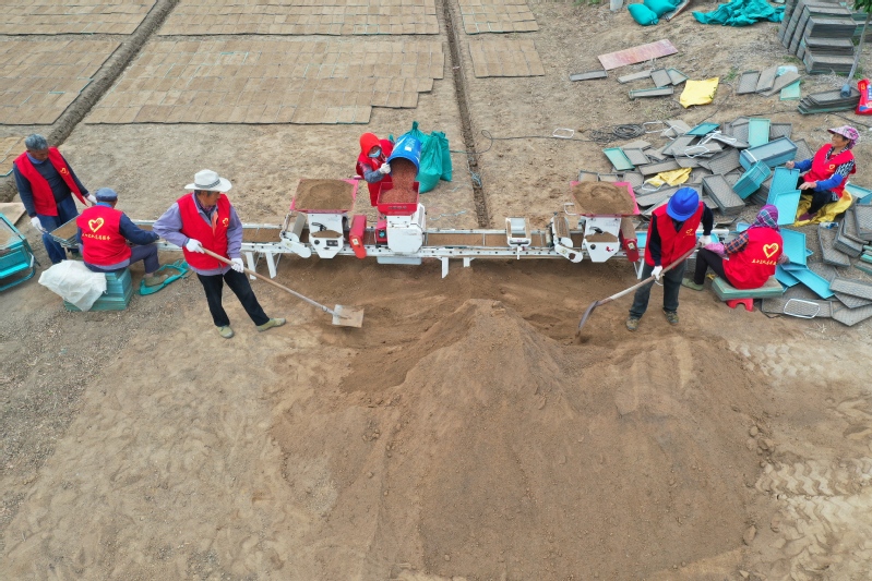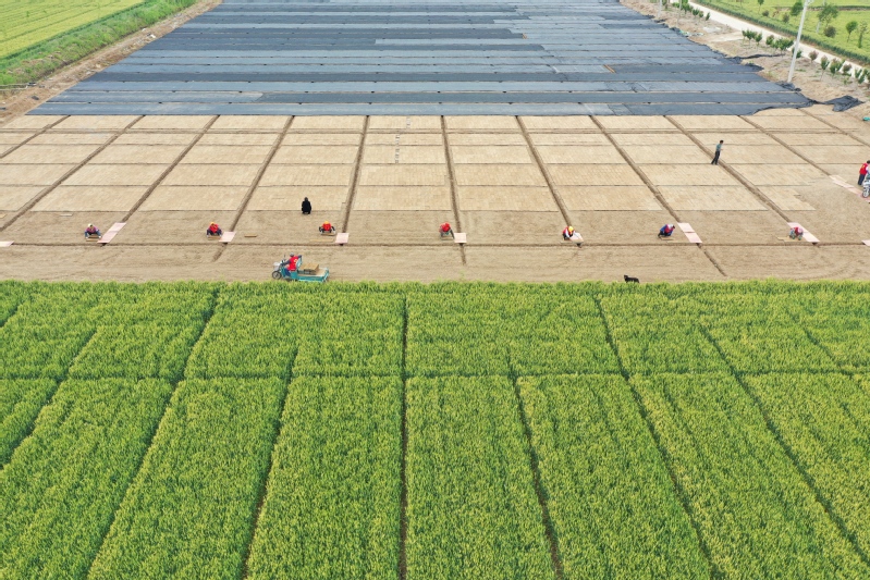 5月10日,寶應湖農場五七大隊田間,10名志愿服務者正在如火如荼地進行流水線育秧。