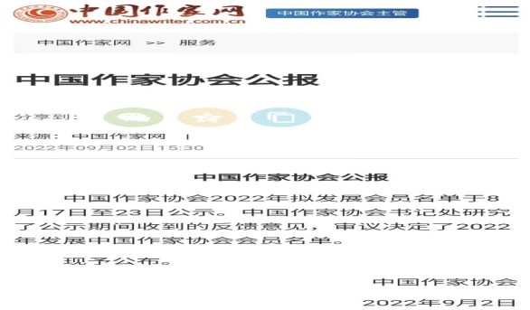 近日,根據(jù)中國作家協(xié)會公報,中國作家協(xié)會2022年擬發(fā)展會員名單于8月17日至23日公示。中國作家協(xié)會書記處研究了公示期間收到的反饋意見,審議決定了2022年發(fā)展中國作家協(xié)會會員名單,并于2022年9月2日進(jìn)行公布。其中江蘇60人,江心沙農(nóng)場有限公司90后職工袁偉榜上有名。