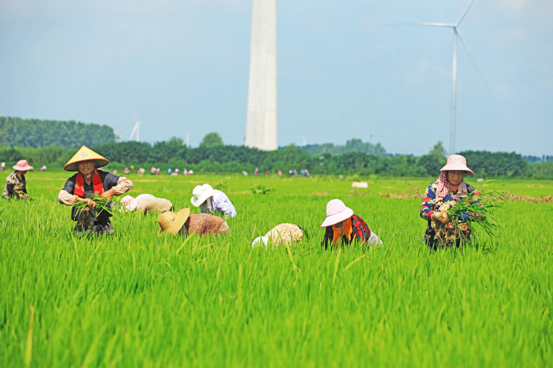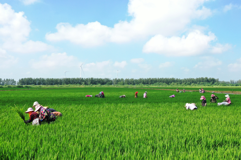 蘇墾農(nóng)發(fā)寶應(yīng)湖分公司擁有3500畝有機(jī)稻生產(chǎn)基地,該基地于2021年取得歐盟、國(guó)環(huán)雙認(rèn)證。為保障有機(jī)稻質(zhì)量,每到夏季,公司都會(huì)組織進(jìn)行人工拔“雜草稻”。高溫炙烤下,200多名勞動(dòng)者揮汗如雨,為生產(chǎn)出“魚米之鄉(xiāng)”高質(zhì)量有機(jī)米貢獻(xiàn)力量。