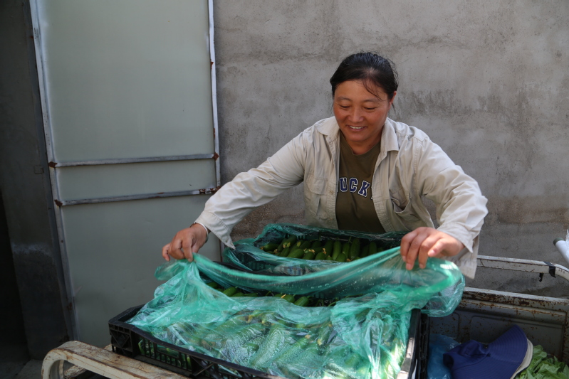 “劉大姐,像這樣的次果別放在筐子里,這是要打包送到保真超市的,咱得確保果型質(zhì)量呀!”9月4日上午,在崗埠富民農(nóng)業(yè)科技園32號(hào)大棚門(mén)前,一筐筐剛摘下的水果黃瓜翠綠欲滴,工作人員崔士平正在仔細(xì)整理挑選水果黃瓜,準(zhǔn)備裝車(chē)送往連云港市區(qū)的保真超市。