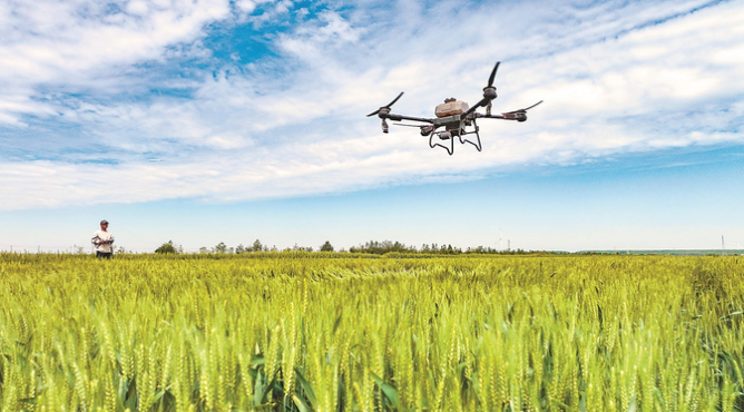 在射陽(yáng)縣江蘇農(nóng)墾新洋農(nóng)場(chǎng),無(wú)人機(jī)飛手進(jìn)行“一噴三防”作業(yè)。張偉生