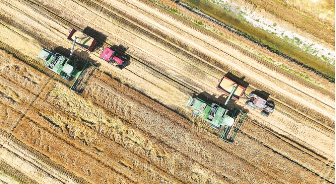 5月22日,大型聯(lián)合收割機(jī)駛?cè)肷潢?yáng)縣新洋農(nóng)場(chǎng)新中生產(chǎn)區(qū)13大隊(duì)的高標(biāo)準(zhǔn)農(nóng)田,對(duì)成熟的大麥開(kāi)展機(jī)收作業(yè),開(kāi)啟了夏收“第一鐮”。 張偉生 攝 (視覺(jué)江蘇網(wǎng)供圖)