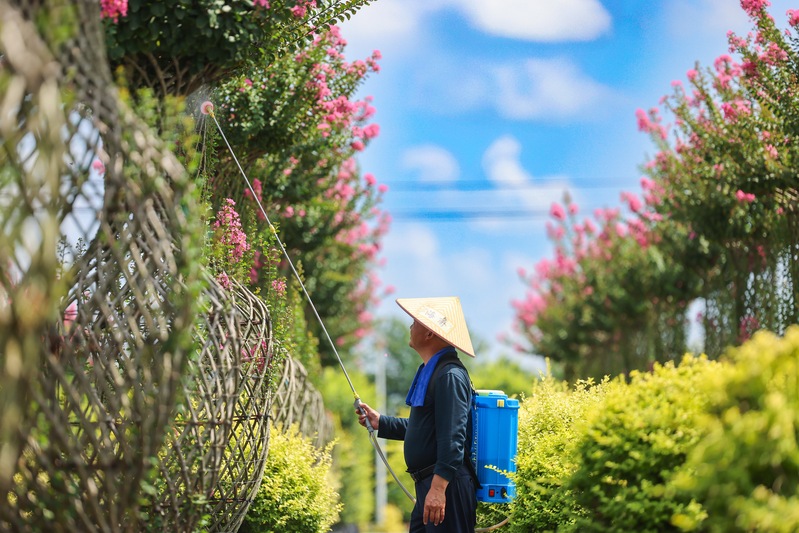 8月14日,江蘇省鹽城市射陽(yáng)縣,在江蘇農(nóng)墾新洋農(nóng)場(chǎng)容器苗項(xiàng)目基地,管理人員正在為紫薇花瓶噴施藥物防病治蟲。據(jù)悉,新洋農(nóng)場(chǎng)建成配有水肥一體、智能控制等設(shè)備的容器苗圃200畝。張偉生攝(中經(jīng)視覺(jué))