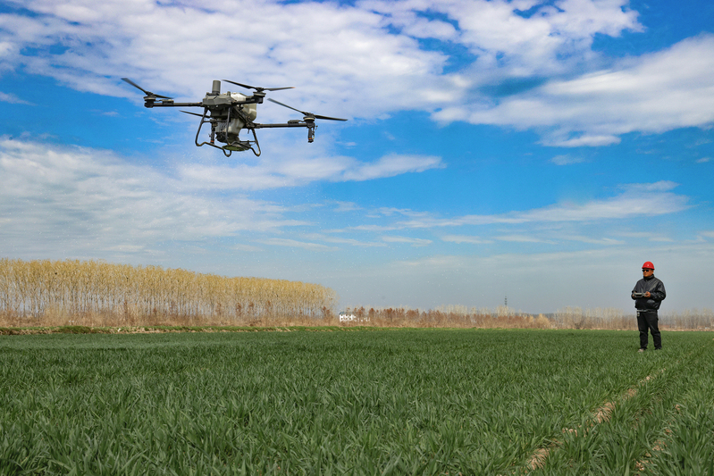 3月13日,江蘇省鹽城市射陽縣,在江蘇農墾新洋農場的一處高標準農田里,農技人員正在操縱一臺新式植保無人機,為小麥開展春季施肥作業(yè)。當前,新洋農場6萬畝高標準農業(yè)生產基地進入春管關鍵階段,該農場搶抓農時,積極開展春季田管作業(yè),助力夏糧穩(wěn)產增收。