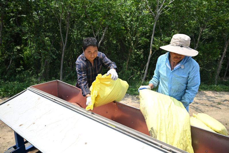 5月28日、「9機(jī)能一體型」稲?麥用耕運(yùn)播種機(jī)にもみを補(bǔ)充する三河農(nóng)場(chǎng)の職員。(盱眙=新華社記者/季春鵬)