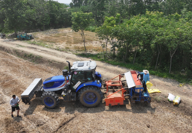 5月28日、「9機(jī)能一體型」稲?麥用耕運(yùn)播種機(jī)にもみを補(bǔ)充する三河農(nóng)場(chǎng)の職員。(ドローンから、盱眙=新華社記者/季春鵬)