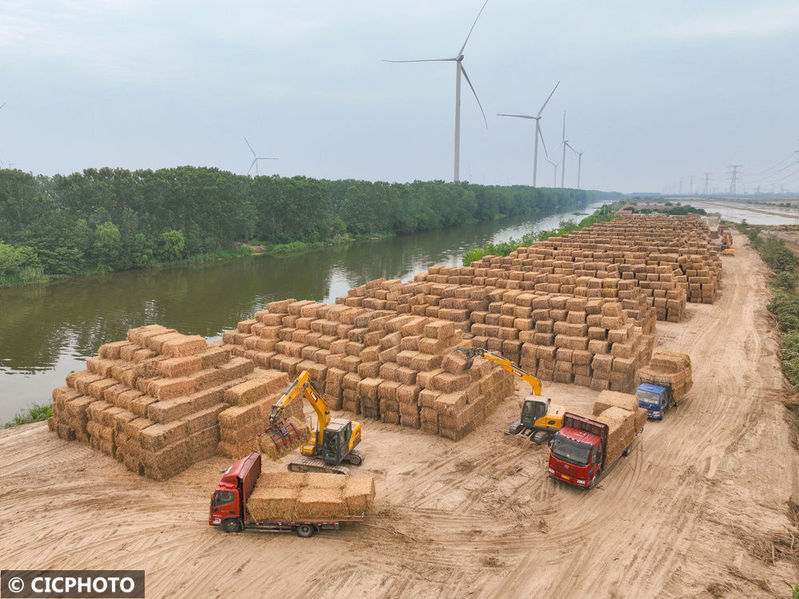 ↑2025年6月7日,在位于江蘇省鹽城市射陽縣的江蘇農(nóng)墾新洋農(nóng)場(chǎng)秸稈回收中心,農(nóng)民駕駛機(jī)械整理回收的小麥秸稈。(無人機(jī)照片)CICPHOTO/張偉生 攝
