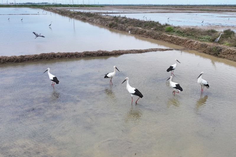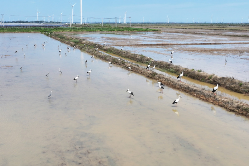 6月23日,江蘇省鹽城市射陽縣臨海農場順泰生產區(qū)的水田里,50余只國家一級保護動物東方白鸛姿態(tài)優(yōu)雅,正悠然漫步、覓食,與水田的碧波相互映襯,構成一幅靈動的生態(tài)畫卷。