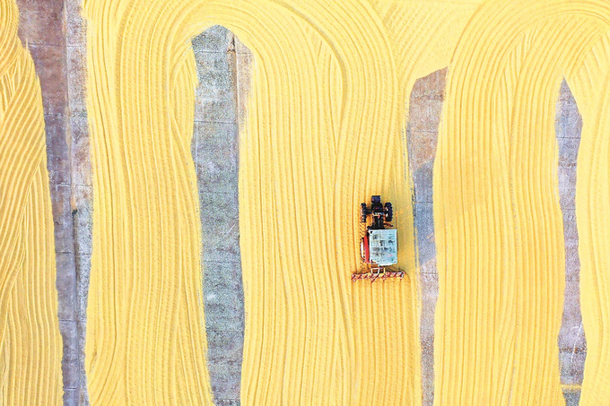 10月27日,連云港市海州區(qū)的江蘇農(nóng)墾崗埠農(nóng)場(chǎng),職工駕駛糧食翻曬機(jī)械在場(chǎng)上來(lái)回穿梭,翻曬剛剛收獲的水稻。 陶桂軍 嚴(yán)連鳳 攝(視覺(jué)江蘇網(wǎng)供圖)