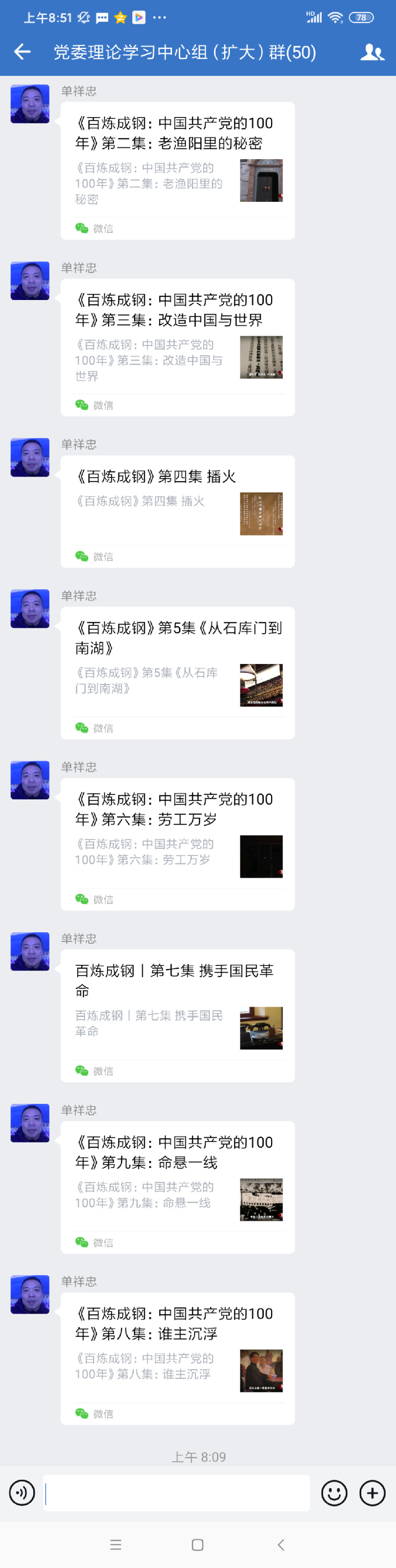 淮海農(nóng)場(chǎng)公司在昨天傍晚接到江蘇農(nóng)墾黨史學(xué)習(xí)教育第三組《關(guān)于組織收看百集微紀(jì)錄片百煉成鋼:中國(guó)共產(chǎn)黨的100年”的通知》后,立刻借助企業(yè)微信平臺(tái)黨委理論學(xué)習(xí)中心組(擴(kuò)大)群進(jìn)行轉(zhuǎn)發(fā)落實(shí),農(nóng)場(chǎng)黨委書記單祥忠在今天上午便將搜集來(lái)的《百煉成鋼:中國(guó)共產(chǎn)黨的100年》的紀(jì)錄片第1至第9集的視頻發(fā)布的學(xué)習(xí)群中,并以此來(lái)進(jìn)一步激發(fā)起廣大黨員干部職工學(xué)習(xí)黨史的熱情,在方便大家觀看學(xué)習(xí)中,不斷提升黨史的學(xué)習(xí)教育成效。