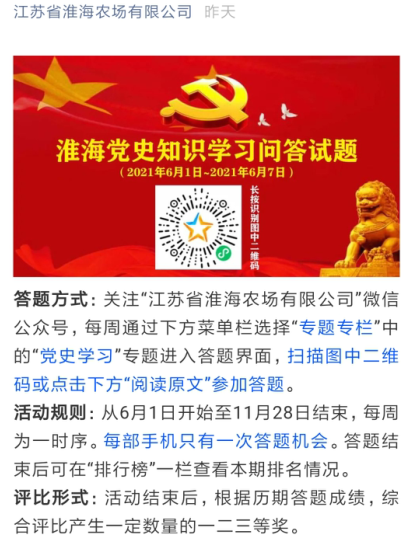淮海農(nóng)場公司黨委工作部將在每周一通過農(nóng)場公司微信公眾號平臺發(fā)布當周黨史學習教育答卷考題,分別以單選、多選、對錯題型出現(xiàn),讓大家在參與中,回顧黨的光輝歷程,謳歌黨的豐功偉績,為推動淮海高質(zhì)量發(fā)展提供有力保障。據(jù)悉,每部手機只有一次答題機會。答題結(jié)束后可以在“排行榜”一欄查看自己當期在本周本時段的排名。答題方式:關(guān)注“淮海微信公眾號”,每周通過下方菜單欄進入本周答題頁面進行答題。活動獎勵:將根據(jù)答題成績和參賽人員數(shù)量,最張產(chǎn)生出一定數(shù)量的一二三等獎。