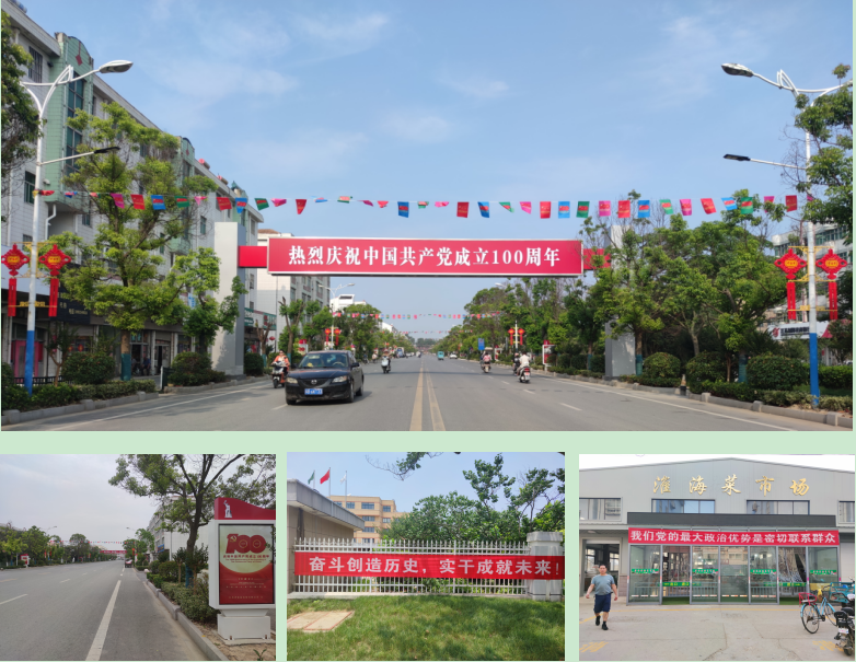 漫步在淮海路上,高大上的跨路宣傳標語、紅彤彤的宣傳櫥窗、飄動的百年慶典標識,還有那些一幅幅與百年慶典有關的宣傳橫幅,和優(yōu)美的農(nóng)場生態(tài)環(huán)境相互輝映,處處洋溢著喜慶的氛圍。