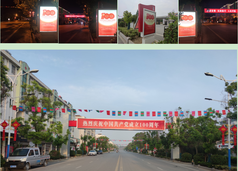 據(jù)了解,為了在黨的百年生日這一天,在農(nóng)場淮海路上營造出濃郁的宣傳氛圍,農(nóng)場公司通過建造一座跨路燈光宣傳橫幅標(biāo)語,設(shè)置36座路邊黨史及軍墾文化的宣傳燈箱,在路燈之間懸掛“慶祝中國共產(chǎn)黨成立100周年”標(biāo)識的彩旗,加上懸掛的標(biāo)語、紅色喜慶的中國結(jié)燈飾和夜晚樓宇燈光秀的點(diǎn)綴,將慶祝建黨百年以燈光為主題的宣傳內(nèi)容,有機(jī)融入農(nóng)場小城鎮(zhèn)的氛圍環(huán)境中來,讓淮海農(nóng)場黨史學(xué)習(xí)教育宣傳更具特色,通過嶄新的小城鎮(zhèn)面貌,在淮海營造出喜迎中國共產(chǎn)黨成立100周年的良好氛圍。