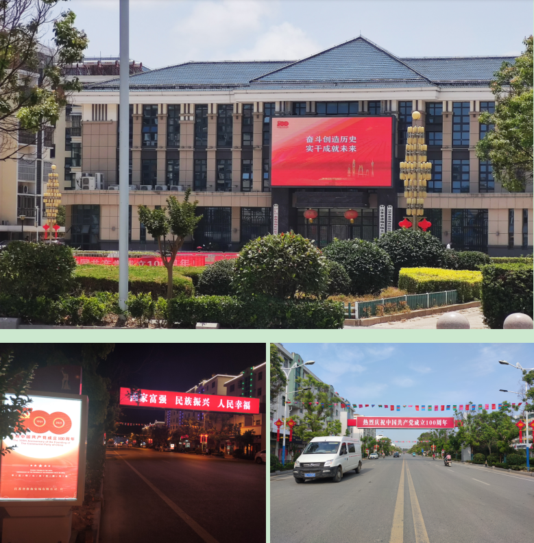 利用《淮海大地》報刊登淮海黨史學(xué)習(xí)教育重大活動和特色情況,并在報紙上開辟“黨史學(xué)習(xí)教育在淮?!薄啊畬W(xué)史力行 爭當(dāng)先鋒’征文”專欄,讓農(nóng)場開展的黨史學(xué)習(xí)教育任務(wù)通過傳統(tǒng)媒體的分發(fā),讓大家知曉農(nóng)場公司黨史學(xué)習(xí)教育情況;利用櫥窗開設(shè)專欄,目前已連續(xù)兩期刊登了農(nóng)場黨史學(xué)習(xí)教育專欄,通過圖文并茂的形式,將農(nóng)場新近開展黨史學(xué)習(xí)教育的做法直觀地展現(xiàn)出來,讓大家知其然,更知其所以然,從而在農(nóng)場深化黨史學(xué)習(xí)教育的成果;通過現(xiàn)代媒介的微信公眾號進(jìn)行黨史學(xué)習(xí)教育的傳播,到目前為止,已經(jīng)發(fā)布有關(guān)黨史學(xué)習(xí)教育的各類會議、做法、經(jīng)驗(yàn)及參與互動等44篇文章,將黨史學(xué)習(xí)借助現(xiàn)代互聯(lián)網(wǎng)進(jìn)行傳播,提升淮海黨史學(xué)習(xí)教育在農(nóng)場內(nèi)外的效果和影響力;在農(nóng)場公司廣大黨員和青年員工中開展黨史知識題目有獎專項(xiàng)征集活動,并從6月1日起連續(xù)開展26個星期為平臺的黨史知識有獎競賽活動周,有效地提升農(nóng)場公司黨員干部和管理人員的積極性,促進(jìn)了大家實(shí)施以考促學(xué),以學(xué)促干活動的熱潮;農(nóng)場文化廣場是淮海人每晚休閑娛樂的場所,農(nóng)場通過在廣場前的LED大屏上播放黨史學(xué)習(xí)教育相關(guān)的紅色電影、微紀(jì)錄片、標(biāo)語、習(xí)總書記七一講話及新聞聯(lián)播等內(nèi)容;在文化廣場東側(cè)樓體上書寫“人民有信仰 國家有力量 民族有希望”廣告牌,利用淮海路跨路廣告宣傳牌,書寫“熱烈慶祝中國共產(chǎn)黨成立100周年!”“國家富強(qiáng) 民族興旺 人民幸?!卑鬃旨t底燈光標(biāo)語,利用淮海路兩側(cè)燈光廣告宣傳牌的效應(yīng),弘揚(yáng)軍墾傳統(tǒng)文化,從而達(dá)到弘揚(yáng)主旋律,振奮人心的作用;利用農(nóng)場企業(yè)微信平臺,組建網(wǎng)上農(nóng)場黨委理論中心組(擴(kuò)大)群,通過每月配發(fā)“第一議題”材料,將習(xí)近平總書記的重要講話內(nèi)容原文全文轉(zhuǎn)載;網(wǎng)上黨史學(xué)習(xí)教育課堂的開展及紅色紀(jì)錄片的推送,將每項(xiàng)江蘇省農(nóng)墾集團(tuán)公司黨史學(xué)習(xí)教育工作簡報上傳平臺,讓大家實(shí)時了解墾區(qū)黨史學(xué)習(xí)教育活動的開展情況和發(fā)展動態(tài),從中汲取黨史學(xué)習(xí)教育中的閃光點(diǎn),根據(jù)自身單位的實(shí)際來觸類旁通、為我所用,從而提升黨史學(xué)習(xí)教育的成果;利用農(nóng)建四師陳列館國家AA級紅色旅游基地的優(yōu)勢,除安排基層黨組織和黨員干部入館接受黨史學(xué)習(xí)和軍墾傳統(tǒng)文化教育外,自黨史學(xué)習(xí)教育開展以來,已為墾區(qū)內(nèi)外3000多人次黨員干部和職工群眾提供講解服務(wù)。圖為淮海部分黨史學(xué)習(xí)教育宣傳標(biāo)語。