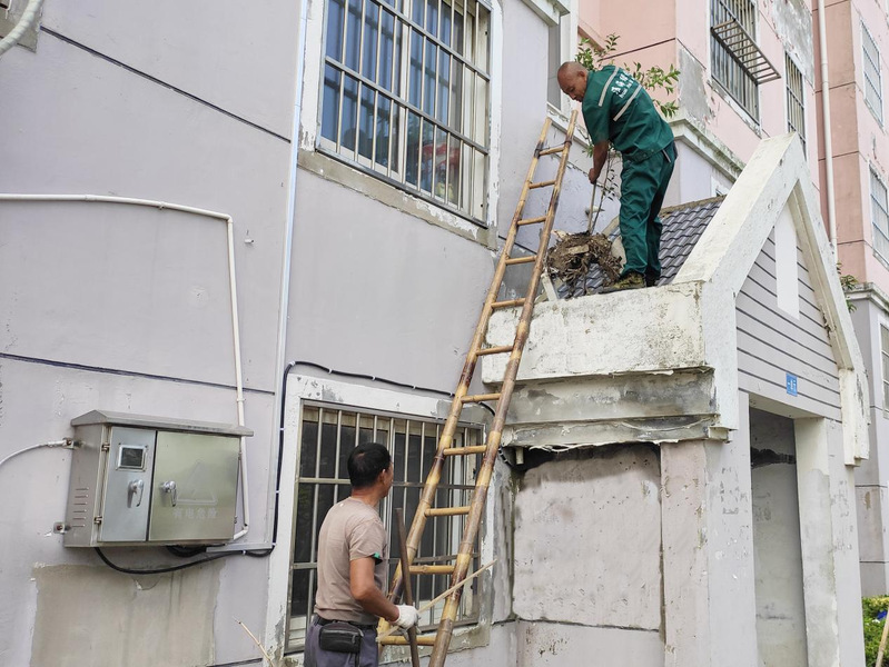 在黨史學(xué)習(xí)教育過程中,農(nóng)場(chǎng)社區(qū)城南居委會(huì)的黨員干部和網(wǎng)格員在走訪調(diào)研過程中,發(fā)現(xiàn)沿路的一些樓房單元門頂棚上積攢了許多垃圾,單純從地面上看,有的看不到,但也有的看到長(zhǎng)出的一些雜草或小樹簇立在那兒;而如果從居家的窗口特意望去,就可看到垃圾存在,而且十分不雅觀。為進(jìn)一步營(yíng)造凈化、美化的轄區(qū)環(huán)境,近日,淮海社區(qū)城南居委會(huì)聯(lián)合環(huán)衛(wèi)所相關(guān)人員一起,針對(duì)淮海路沿線樓房的單元門頂棚存在的垃圾、雜物現(xiàn)象開展了專項(xiàng)清理整治行動(dòng)。