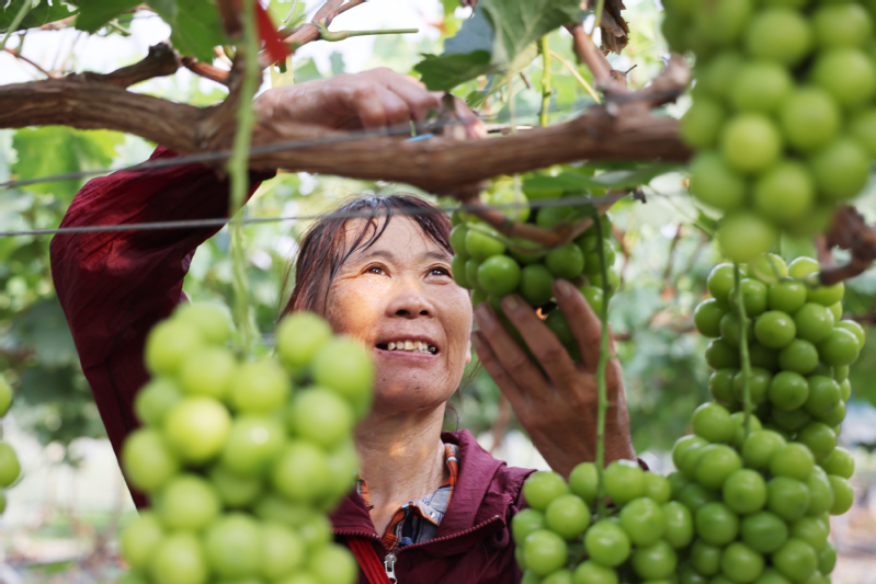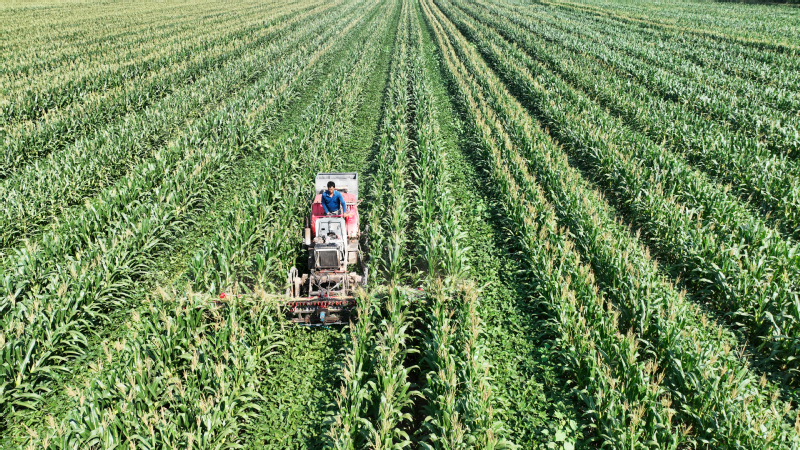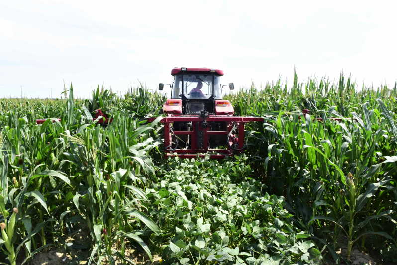 玉米雄穗剛露頭尚未開花散粉時進行去頂(去掉玉米雄穗),既能讓玉米提前成熟3-5天,又可以使玉米籽粒灌漿相對集中、減少養(yǎng)分消耗,可以降低株高防風防倒,改善玉米基部及行間大豆光照積累,減少穗部易患玉米螟、蚜蟲等害蟲的危害,從而達到增產的目的。蘇墾農發(fā)淮海分公司通過引進2臺玉米切頂機,對5000多畝玉米大豆帶狀復合種植田間的玉米雄穗進行切頂作業(yè),據悉,每臺機械每天可以作業(yè)200畝,極大地提升了工作效率。圖為8月16日,淮海分公司運用大機械在玉米大豆帶狀復合種植田間對玉米雄穗進行切頂作業(yè)。