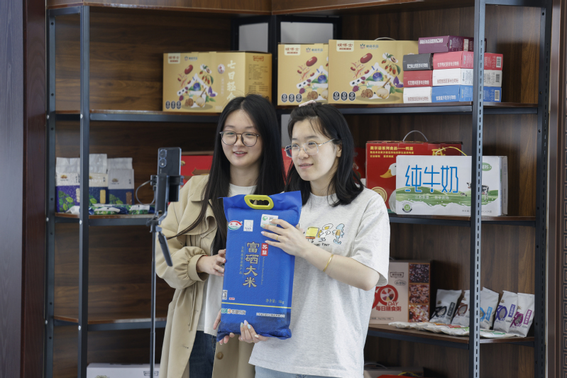 新洋農(nóng)場美爾姿創(chuàng)新“線下體驗+線上便捷”雙渠道聯(lián)動模式,實現(xiàn)線上線下融合運營,既提升品牌影響力,又讓消費者品嘗到墾區(qū)優(yōu)質(zhì)農(nóng)產(chǎn)品。圖為主播在直播間推薦農(nóng)副產(chǎn)品。