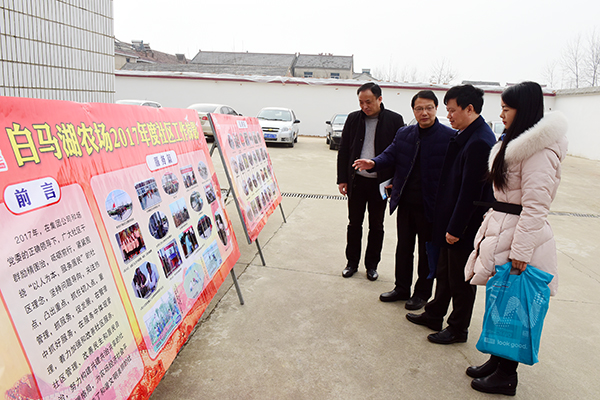 1月19日,由集團公司人力資源部、社會事業(yè)部、資產(chǎn)經(jīng)營部、審計監(jiān)察部組成的聯(lián)合考核組一行到白馬湖農(nóng)場對2017年度重點工作完成情況及所取得主要成績等進行綜合考核,農(nóng)場領(lǐng)導(dǎo)姚春華、韓躍武及相關(guān)部門負責人陪同考核并匯報情況。