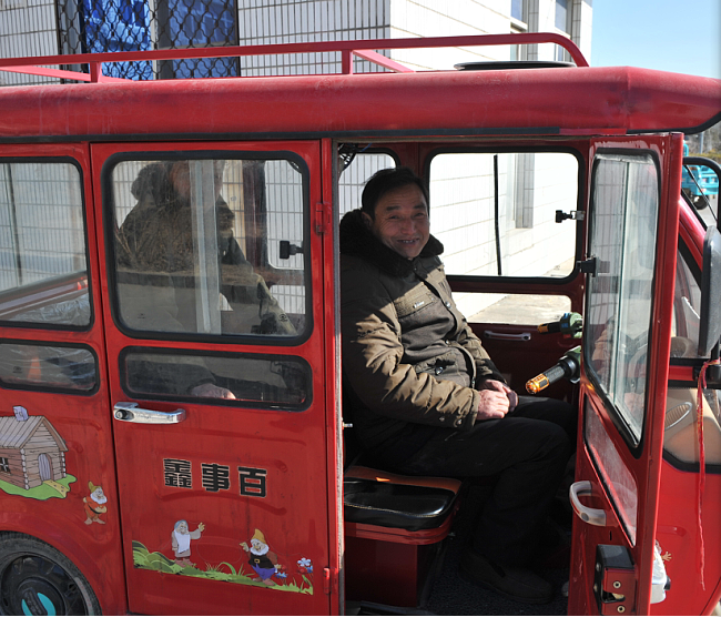 畫面中的駕駛員是淮海農(nóng)場(chǎng)四分場(chǎng)社區(qū)54歲的黃玉青,弱智又低收入的他,每月靠400元的低保維持著簡(jiǎn)單的生活。2017年農(nóng)場(chǎng)組織科長(zhǎng)林一高和四分場(chǎng)二十八大隊(duì)隊(duì)長(zhǎng)王扣林與其結(jié)成精準(zhǔn)幫扶對(duì)子后,他在獲得幫扶的同時(shí),也更是激發(fā)了黃玉青自主創(chuàng)業(yè)的動(dòng)力。黃玉青每天開著一輛百事鑫電動(dòng)三輪車,停泊在醫(yī)院門前接客,在方便他人的同時(shí),也為自己增加了收入。瞧,載著客人的黃玉青笑得是多么地燦爛。