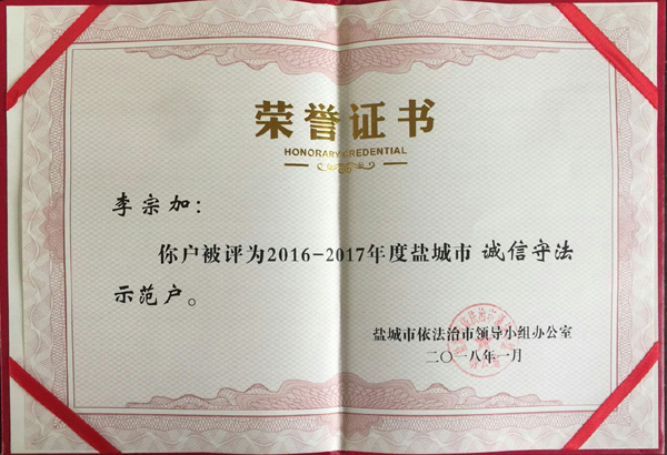 近日傳來喜訊,新洋農場有限公司李宗加、朱雪芹、王毓松三戶職工家庭被評為射陽縣“誠信守法示范戶”,其中李宗加還被評為鹽城市“誠信守法示范戶”。