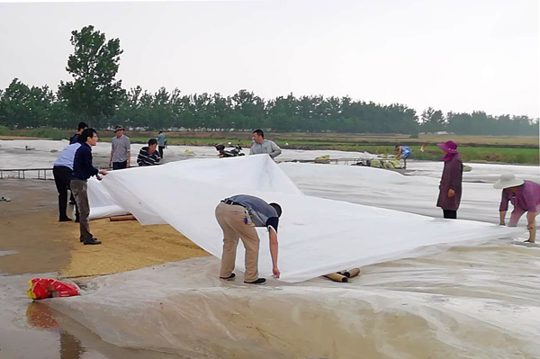 “雨中搶場”,雨急風(fēng)大,大家推糧的推糧,蓋雨布的蓋雨布,壓邊的壓邊,全然不顧場上細雨紛紛,塵土飛揚,緊張而有序地跟“老天爺”搶時間、比速度。據(jù)悉,經(jīng)過廣大干群近40分鐘的共同努力,緊急搶場,所有場面夏糧均安全進入了雨布之下……。