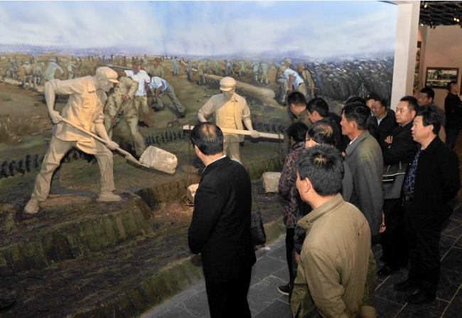 在新征程中勿忘“大鍬、扁擔(dān)”,就是要求我們要接過軍墾先輩們的精神接力棒,以腳踏實(shí)地的干勁,以舍我其誰的擔(dān)當(dāng),來為了讓更多的職工群眾能過上美好幸福生活的向往。特別是在時(shí)下廣泛開展的“不忘初心、牢記使命”的主題教育中,更需要我們深入貫徹黨的十九大精神,牢固樹立以人民為中心的思想,一切為了人民,一切依靠人民,唯有這樣,我們才能在新征程的道路上,無往而不勝。圖為客人們?cè)谵r(nóng)建四師陳列館中觀看以江希友和仇泉原型創(chuàng)作的“江大鍬”和“仇大筐”雕塑模型。