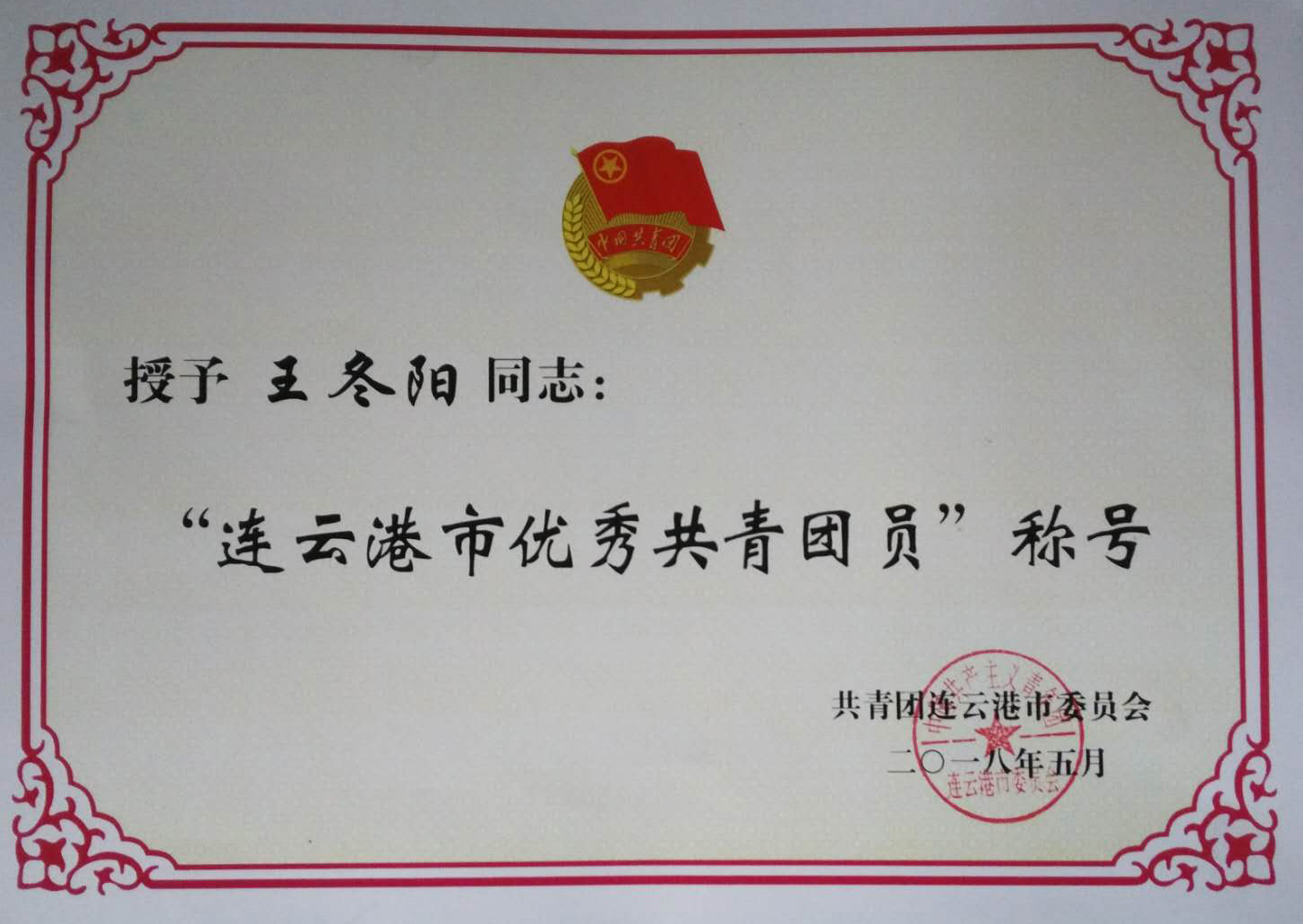 近日,從共青團(tuán)連云港市委員會(huì)傳來(lái)喜訊,東辛農(nóng)場(chǎng)社區(qū)東方路居委會(huì)干事王冬陽(yáng)被授予2017年度“連云港市優(yōu)秀共青團(tuán)員”榮譽(yù)稱(chēng)號(hào)。