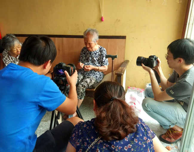 當(dāng)天一整天,澎湃新聞采訪組一行圍繞老人的生活起居活動(dòng),以紀(jì)實(shí)的手法全程展開(kāi)。凌晨5點(diǎn)多種,澎湃新聞?dòng)浾呔蛠?lái)到了張瑞瑞的家中,按照老人的作息規(guī)律,實(shí)時(shí)拍攝老人起床、喝早茶、散步、游玩和回家吃早飯、擇菜以及與家人聊天的情況,并找來(lái)與老人相熟的鄰居了解百歲老人先前的一些情況。當(dāng)記者從新聞媒體上獲悉老人還會(huì)穿針引線做針線活時(shí),老人的家人特地拿來(lái)針線和一道破損的衣襟,讓老人展示。沒(méi)曾想,老人一拿到針線,還笑說(shuō)嗔怪地說(shuō),你們這些年輕人不弄,叫我一個(gè)老人做,惹得大家哈哈大笑。隨后,老人認(rèn)真地穿起了針線來(lái),雖然第一根線頭有點(diǎn)毛,但老人卷線頭的動(dòng)作和一手一腳地專注,還是讓在一旁的記者贊嘆,他們不時(shí)地用近景拍攝著老人穿針引線的過(guò)程。也就一會(huì)兒,老人成功地穿過(guò)了一根線,隨即用更快的動(dòng)作穿完了第二根針。這一連貫的動(dòng)作,把記者的眼睛都看花了。“叫我穿,我肯定穿不過(guò)去。”澎湃新聞?dòng)浾咧靷ポx說(shuō)。