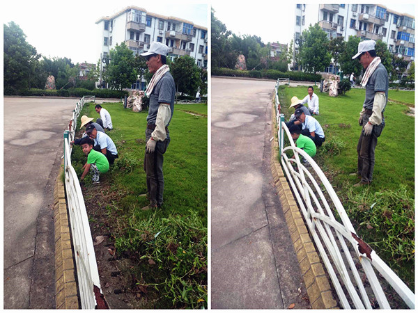 8月22日下午5點(diǎn),在新洋農(nóng)場有限公司機(jī)關(guān)大樓門前的草地上,幾名綠化工正在拔里面的雜草,他們當(dāng)中,一個(gè)穿綠衣服、看上去四五歲的小男孩吸引了路人的注意。