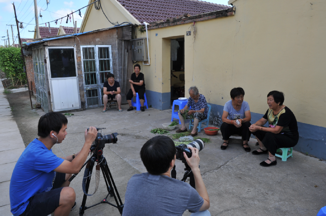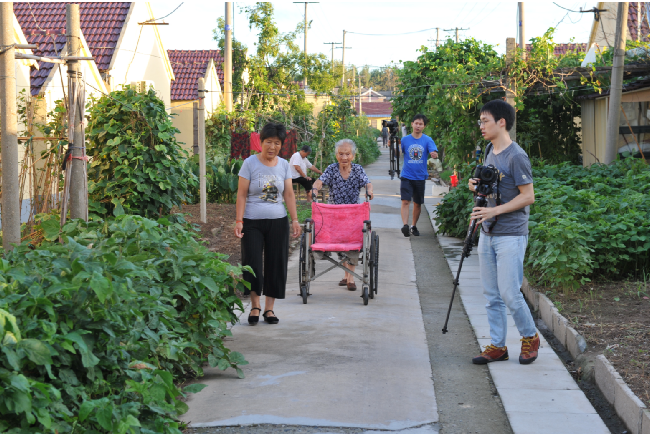 8月20下午-21日,澎湃新聞采訪組視頻記者朱偉輝、視頻編輯龍景和射陽縣新聞單位的3名記者在農(nóng)場宣傳部門相關(guān)人員的陪同下,用一天半的時(shí)間,實(shí)時(shí)用鏡頭記載百歲老人從凌晨起床、喝早茶、散步、游玩和吃飯、擇菜、做針線活以及與家人、鄰居等聊天的情況,感受百歲老人尋常的起居生活。而每拍攝一場老人的生活起居或是生活畫面,總是讓來自上海澎湃新聞采訪組的記者大加贊嘆。圖為澎湃新聞采訪組在拍攝百歲老人生活起居的一組鏡頭。