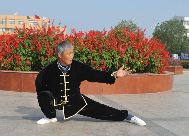 兒子的鼓勵,教練會長的耐心勸導(dǎo)和眾多太極好友的大力支持,從此也讓林耀國克服了自卑的心理,增強(qiáng)了學(xué)練太極的信心。他不但天天早上第一個到現(xiàn)場,找先來的陪著他練太極,晨練結(jié)束后,還留下來請教練對他補(bǔ)課,糾正動作,講解運(yùn)拳舞劍道理?;丶液笏彩菍χR子堅(jiān)持學(xué)練,特別是對高難度動作反復(fù)操練,細(xì)心琢磨每個動作的規(guī)范要領(lǐng),真正做到了拳不離手,訣不離口。功夫不負(fù)有心人,對一個上了歲數(shù)的老人,也這樣的磨練,他從不會到會,從會到比較熟練,僅過了幾個月的時間,基本上能把楊式太極拳24-48式、太極劍32-42式很流暢地用動作展示出來,現(xiàn)在的他已經(jīng)是太極協(xié)會里的主力隊(duì)員了。
