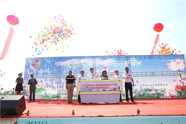 連云港市副市長陳書軍宣布連云港市第四屆荷花節(jié)開幕,并與省農(nóng)墾集團總會計師劉克英、高新區(qū)黨工委書記陳佑龍、市文化廣電和旅游局副局長柏銀枝、市自然資源和規(guī)劃局局長孔令泰、農(nóng)場公司黨委書記劉衛(wèi)華共同為開幕式推動啟動桿,第四屆連云港市荷花節(jié)正式開幕。