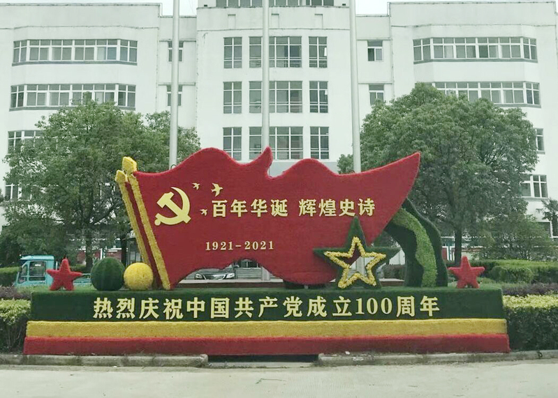 早在5月份,一組熱烈慶祝中國共產(chǎn)黨成立100周年的綠雕就將辦公樓前的花壇裝點一新。根據(jù)慶祝建黨100周年氛圍營造方案,近期,施工人員抓緊對350省道小城鎮(zhèn)段、裕源大道、建場路的燈桿上安裝印有“中國夢”字樣的中國結(jié)景觀燈,同時穿插“不忘初心,牢記使命”、“砥礪奮進,追夢前行”、“聽黨話,跟黨走”以及企業(yè)精神的道旗和宣傳標(biāo)語等,營造出一派紅色、熱烈、喜慶、向上的濃厚氛圍。