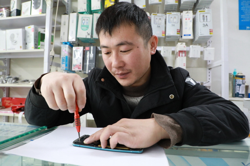 2007年,高中畢業(yè)的趙鵬選擇外出打工,跟著幾個朋友一路北上成為北漂一族。面對自己無技術、無學歷的現(xiàn)狀,以及手機使用率的高漲,頭腦靈活的他第一就業(yè)方向選擇了手機維修。一學就是三年,一個小小的手機他用了整整三年才把手機芯片、集成電路等等全部摸索清晰。用他自己的話說就是學習、學習、再學習,不放過任何可以學習的時間。三年的學徒生涯讓他對自己有了一個清晰的認識,但是北京的房價高、競爭壓力大,無法讓他在這個城市里站穩(wěn)腳跟,于是他選擇了回江蘇工作,拿了所有積蓄和朋友在南京開了一個手機維修店面,這一忙又是三年,這段時間內(nèi)他精益求精,針對手機遇到的不同疑難雜癥,他是“手到病除”。2016年,趙鵬帶著用6年青春時光換來的專業(yè)技術,回到了東辛農(nóng)場,開了一家夫妻店---潤達手機大賣場,主要負責手機維修和銷售等業(yè)務。他開店初期,因為資金不足,不敢投入過大,但在后續(xù)的維修過程中,居民逐漸認可了他的手藝,店面由一個10平方米擴大到了70平方米的門面,員工從原有的夫妻檔加入了2名青年員工,年收入也達到了8萬余元。