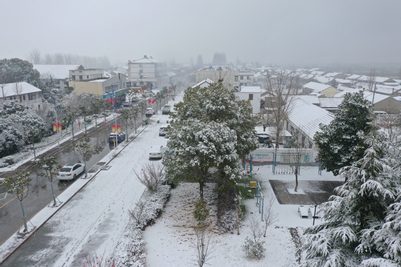 高大的銀杏樹、柿子樹,落光了葉子的枝杈上,一條條毛茸茸、亮晶晶的銀條兒好像蟄伏著的蠶蟲;修長的香樟、低矮的柏樹,四季常青枝葉上,一朵朵蓬松松、沉甸甸的雪球,仿佛舉起的棉花糖。“呼……”一輛晨起的公交車閃著光駛過,一面面紅旗也迎風(fēng)雀躍起來,似乎在說“又是一個豐收年”。