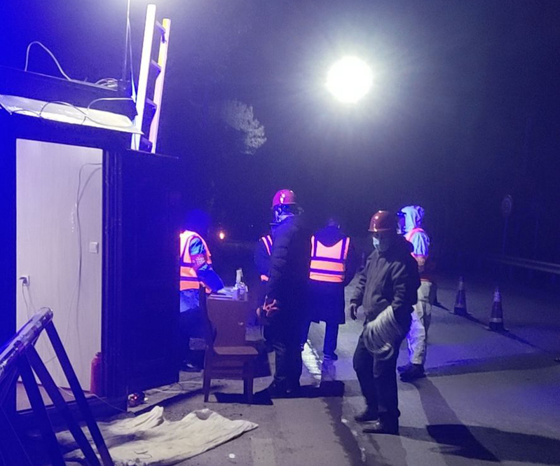 經(jīng)過(guò)2個(gè)多小時(shí)的應(yīng)急處置、奔赴、安裝。給夜幕下的防疫檢查點(diǎn),更加安全、明亮。