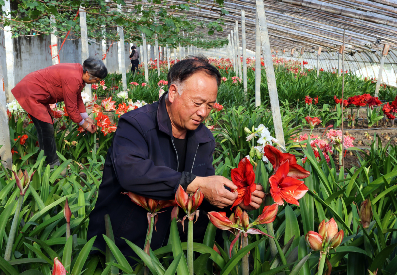 崗埠農(nóng)場(chǎng)公司周恒銀, 和愛(ài)人共同種植5棟溫室大棚,10年來(lái)自己培育朱頂紅品種達(dá)30個(gè)。今年培育朱頂紅種苗15萬(wàn)株,年可銷切花1萬(wàn)枝,種球2萬(wàn)粒,年收入40萬(wàn)元左右,帶動(dòng)10多戶花農(nóng)走上致富路,2022年3月在農(nóng)場(chǎng)公司職工代表大會(huì)上受到表彰。