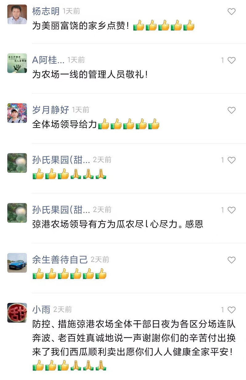 西瓜場來臨正值疫情防控形勢最嚴(yán)峻的時候,按照上級疫情防控要求,弶港農(nóng)場黨委制定出防控西瓜運銷車輛閉環(huán)管理工作方案,成立西瓜運銷“疫”線指揮部,設(shè)立八個工作專班,近百人的西瓜閉環(huán)運銷隊伍,日夜奮戰(zhàn),全程嚴(yán)密管控西瓜運銷貨車閉環(huán)管理,確保全國各地貨車開得進來,農(nóng)場職工西瓜賣得出去。在這場戰(zhàn)役中,全場廣大黨員干部在抗“疫”一線“佩黨徽、亮身份、做表率”,以“一名黨員一面旗幟”的良好形象,全力以赴,吃苦在前、沖在一線,弶港農(nóng)場2萬多噸“弶農(nóng)”牌西瓜順利銷售?!懊利悘夀r(nóng)”視頻號上反映西瓜運銷工作的小視頻,7千多次瀏覽量,幾百人點贊轉(zhuǎn)發(fā),閉環(huán)運銷工作得到廣大職工群眾的一致稱贊,公司黨委書記胡廣斌在工作群中感嘆道“得到群眾的好評不容易”。