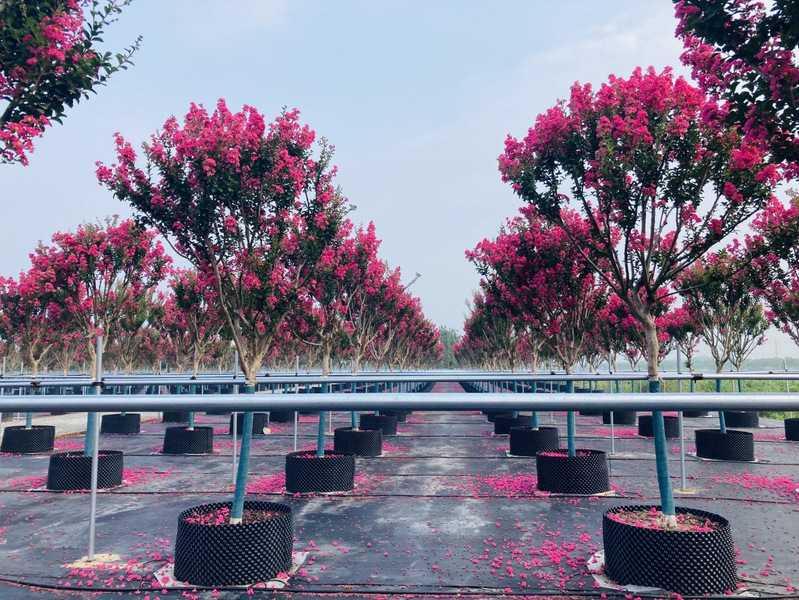 新洋林業(yè)公司容器苗三期當(dāng)下正是一幅花開似霞的盛景,紫薇花團(tuán)團(tuán)簇簇掛滿枝頭,相當(dāng)奪目。拳頭產(chǎn)品“四川紅”紫薇是農(nóng)場公司黨委和林業(yè)公司4月份頂著疫情的壓力,積極爭取引進(jìn)的產(chǎn)品,到了7月份便成為了附近居民的網(wǎng)紅打卡產(chǎn)品,獲得了居民們的一致好評和稱贊。其花期極長,從6月一直持續(xù)到10月,宋代楊萬里贊曰:“誰道花無紅百日,紫薇常放半年花?!泵鞔ピ娫疲骸白限遍_最久,爛漫十旬期。”因此,紫薇也有“百日紅”之稱。