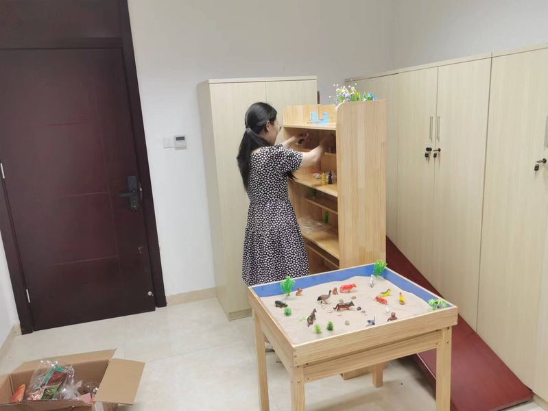 目前,淮海農(nóng)場社區(qū)民政辦正緊鑼密鼓的建立服務(wù)流程和日常管理需要的各類制度,建立健全困境兒童臺賬和活動臺賬,預(yù)估10月底前,“淮海農(nóng)場未成年人保護站”的各項設(shè)施完善配置,并正式開放。圖為社區(qū)民政辦工作人員正布置心理咨詢室設(shè)施。
